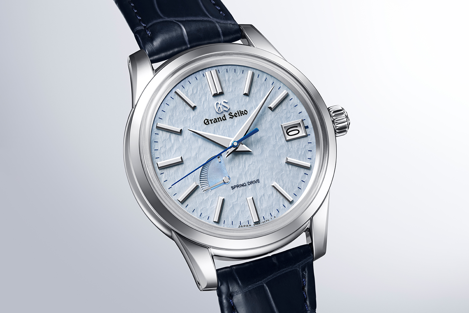 Visible from the Shinshu Watch Studio, where Spring Drive watches are made, the Hotaka mountain range is blanketed with snow for several months each winter. The snow in these mountains is shaped by fierce winds that carve patterns into its surface, a phenomenon that forms the basis of this watch’s “Snowflake” pattern dial. The light blue colour, which inspired the “Skyflake” moniker, evokes the wind-swept snow reflecting the bright blue sky above on a clear winter’s day. The tempered blue seconds hand glides smoothly across the dial, reflecting the silent passage of time.