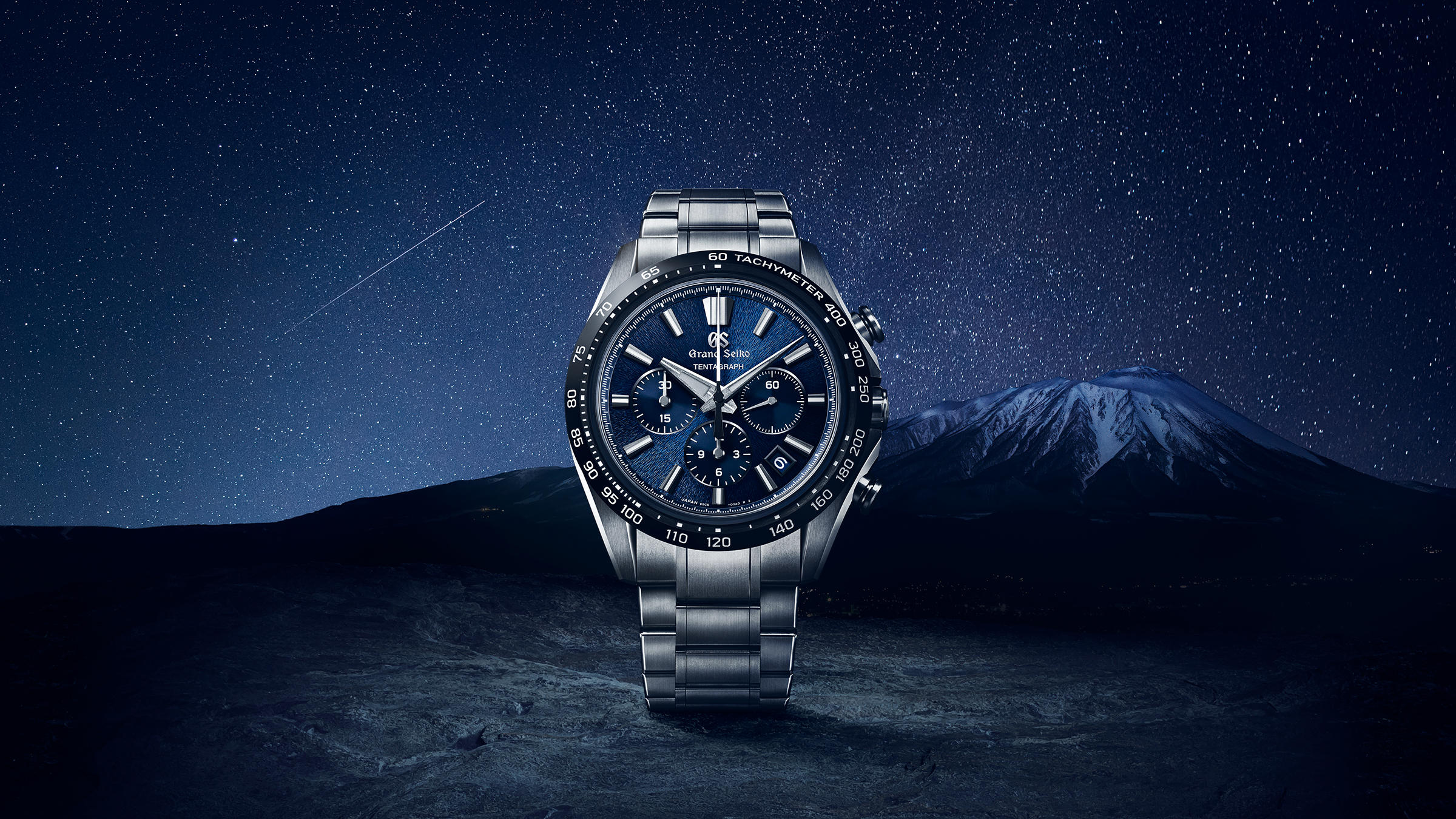 The dial design follows the Evolution 9 Style and adopts a traditional chronograph layout. The distinctive hour and minute hands, along with the indexes with Lumibrite, are positioned with minimal clearance to enhance not only legibility during time measurement but also overall time readability. Mt. Iwate, visible from the Grand Seiko Studio Shizukuishi, serves as a source of inspiration and a spiritual anchor for the craftspeople. The dial combines a delicate pattern inspired by the mountain’s surface with a transparent blue tone, expressing the starry sky that spreads above its summit. This design reflects a vision of reaching the pinnacle of the ideal chronograph.